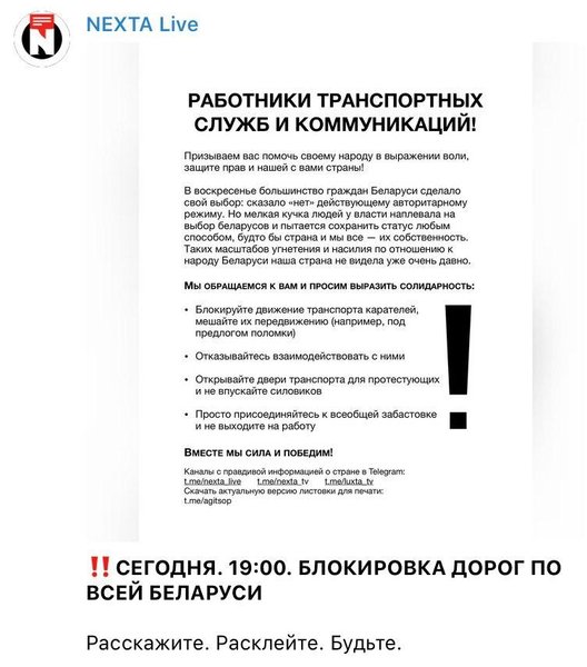 В ней, канал призвал белорусских автомобилистов останавливаться прямо на проезжей части под предлогом поломок. Работников транспортных служб и коммуникаций призвали присоединиться к акциям демонстрантов: открывать двери транспорта для протестующих и не пускать в него силовиков.