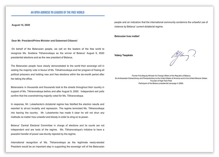 "Белрусский народ явно продемонстрировал миру свою суверенную волю, большинством голосов выбрав госпожу Тихановскую и ее программу освобождения всех политических заключенных, а также проведения новых свободных выборов в течение шести месяцев после ее вступления в должность", – отметил в письме Цепкало.