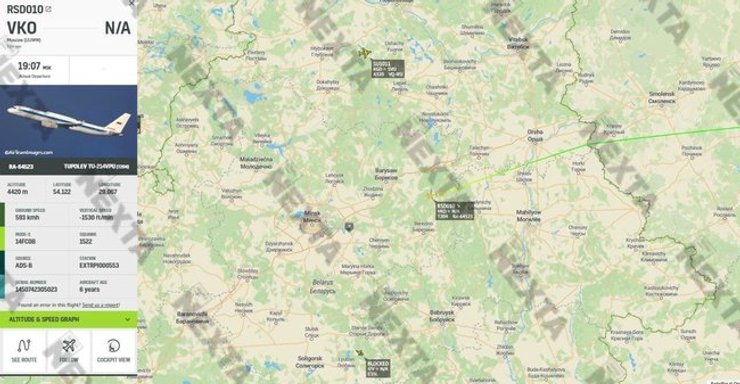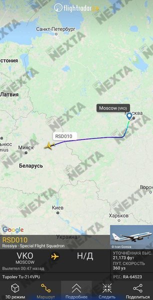 "Несколько минут назад в Минске приземлился Ту-214ПУ (серийный номер 523, регистрационный номер RA-64523), принадлежащий ФСБ РФ. Предположительно, это самолет спецсвязи, предназначенный для полета по кругу вокруг определенных точек во время выездных визитов первых лиц РФ", – говорится в сообщении.