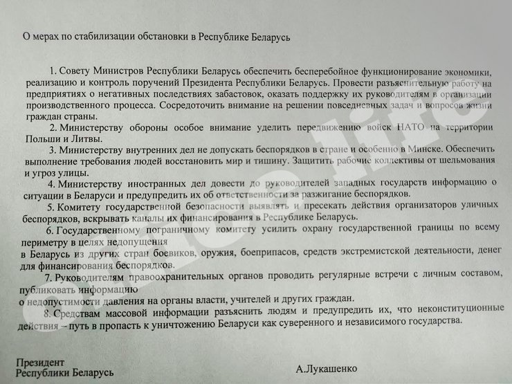 Текст решения белорусского Совбеза эксклюзивно опубликовал минский деловой журнал "Office Life". Сообщается, что власти Беларуси должны были предать огласке это решение только завтра, 26 августа.