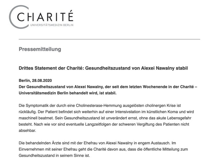 Также в сообщении отмечается, что лечащие врачи Алексея Навального состоят в тесном контакте с его женой Юлией. В согласовании с женой Алексея Навального, клиника Charite исходит из того, что публичное сообщение о состоянии его здоровья – в интересах пациента.