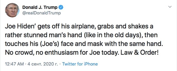 В своем сообщении Трамп написал, что Джо Байден грубо нарушил санитарные нормы во время встречи с семьей афроамериканца Джейкоба Блейка, раненного полицейскими в штате Висконсин.