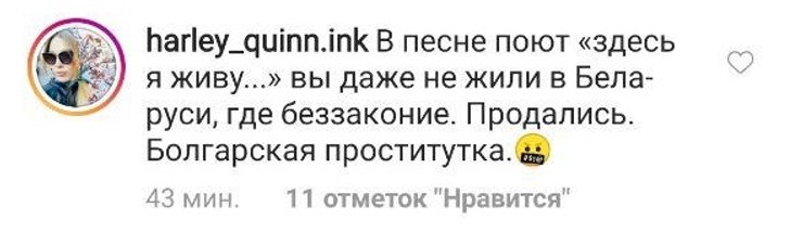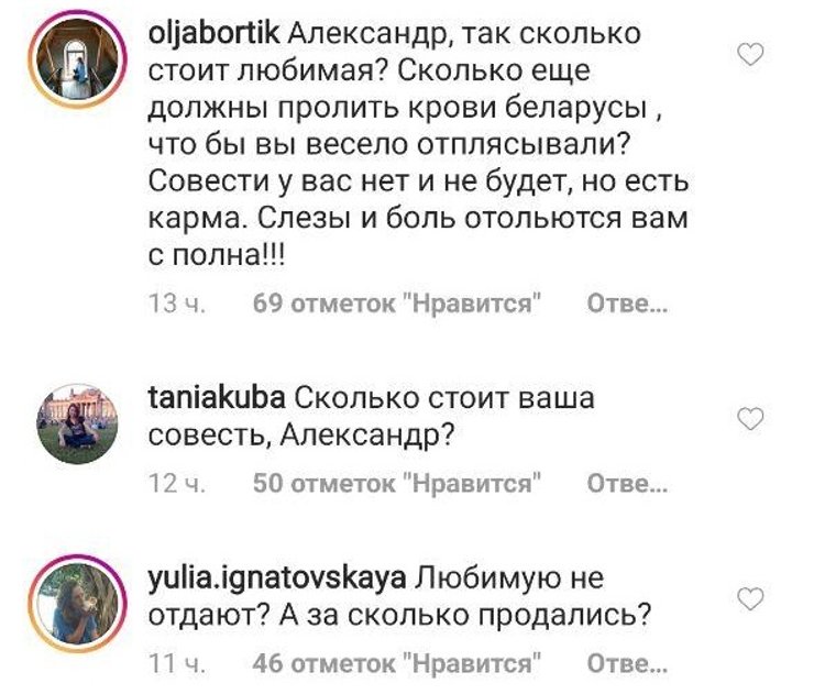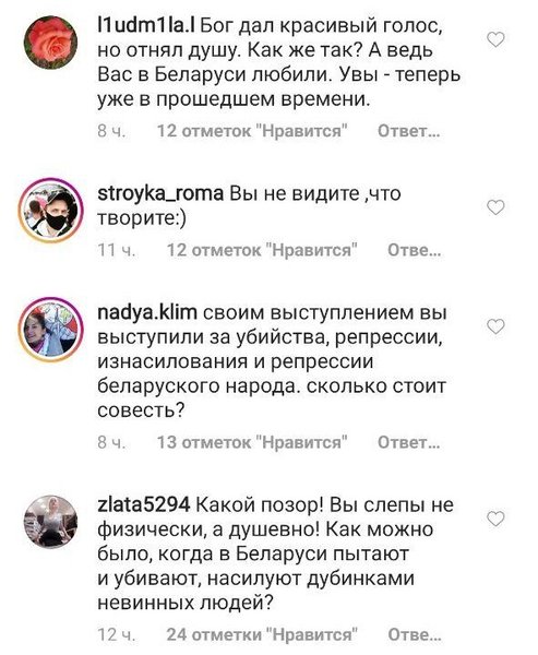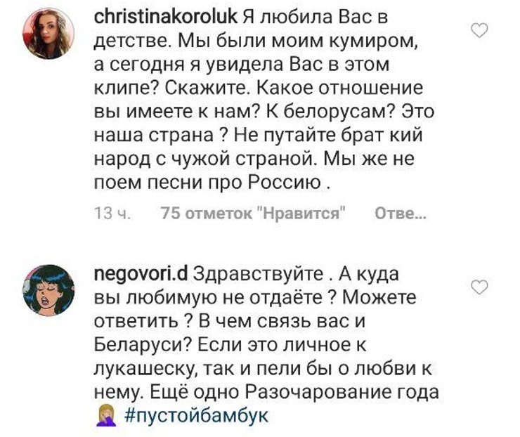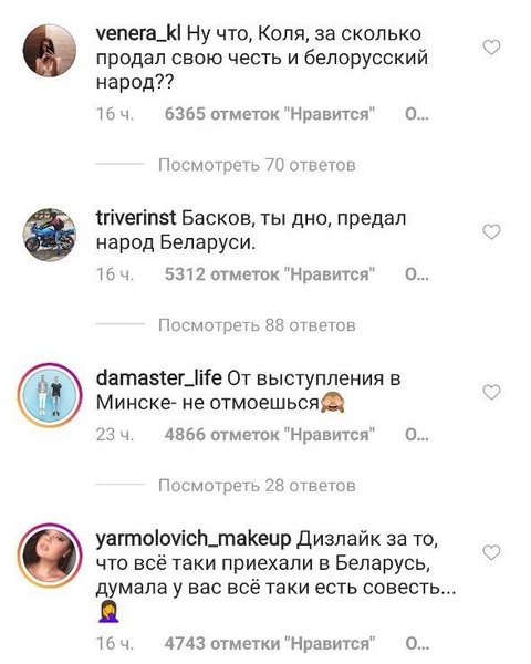 Остальным звездам также досталась порция критики и обвинений в продажности, но меньше всего представителям белорусской эстрады. То ли у них популярность не такая, нежели у российских коллег, то ли не все поклонники успели добраться до их соцсетей. Но Александру Солодухе, который не только принял участие в записи клипа, но и выступил на концерте на "Минск-арене" и сфотографировался там с Басковым, прямо заявили, что он продал и совесть и Родину.