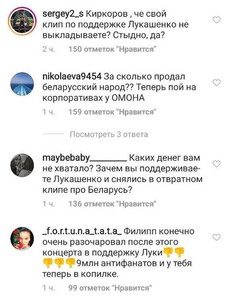 Быстрее всех отреагировал Филипп Киркоров, он комментарии отключил, но пару десятков негативных отзывов успел получить. Так как своим новым творением российские певцы решили на своих страничках не делиться, то комментарии им оставляли под последними постами.