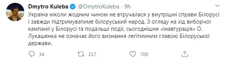 Мировая общественность, в частности европейские страны, отметила, что "бацьку" как президента не признает. Украина, в лице министра иностранных дел Дмитрия Кулебы, отметила, что инаугурация Лукашенко не значит, что он стал легитимным президентом.