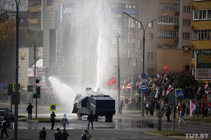 В ходе акций протеста в Минске в воскресенье, 4 октября, протестующие повредили два водомета, которые применяли силовики, чтобы разогнать шествие.