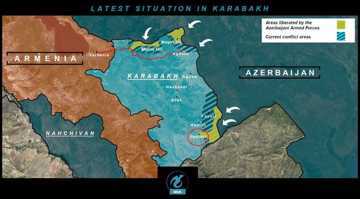 Президент Азербайджана Ильхам Алиев сообщил в Twitter, что военные взяли под контроль город Джабраил в непризнанной Нагорно-Карабахской Республике. Об этом также заявили в Турции. В Армении и Нагорном Карабахе эти данные отрицают.