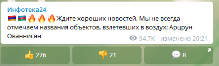 При этом, Телеграм-каналы, поддерживающие Армению и Карабах, анонсировали подобные удары.
