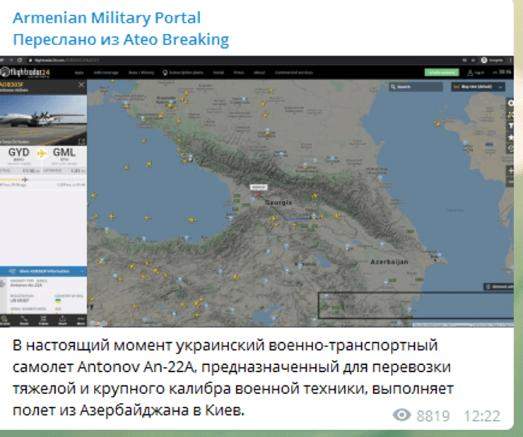 На полет обратили внимание армянские Телеграм-каналы в контексте конфликта в Нагорном Карабахе: