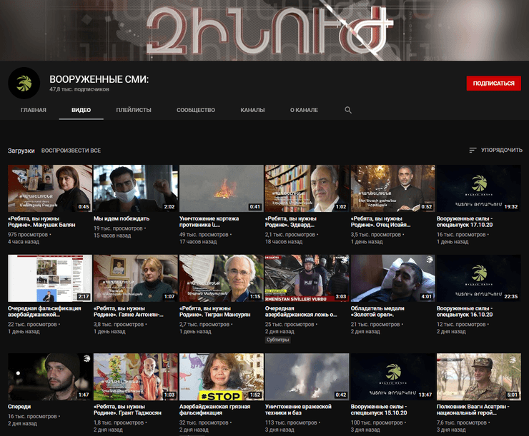 Армянское оборонное ведомство за последние сутки опубликовало только один "военный" видеоролик под названием: "Уничтожение кортежа бронетехники противника", и мы о нем мы уже рассказывали в сводке за воскресенье. Вместо видеороликов с фронта, в последние дни на YouTube-канале Минобороны Армении все больше обращений известных публичных деятелей страны с призывами к добровольной мобилизации в армию.