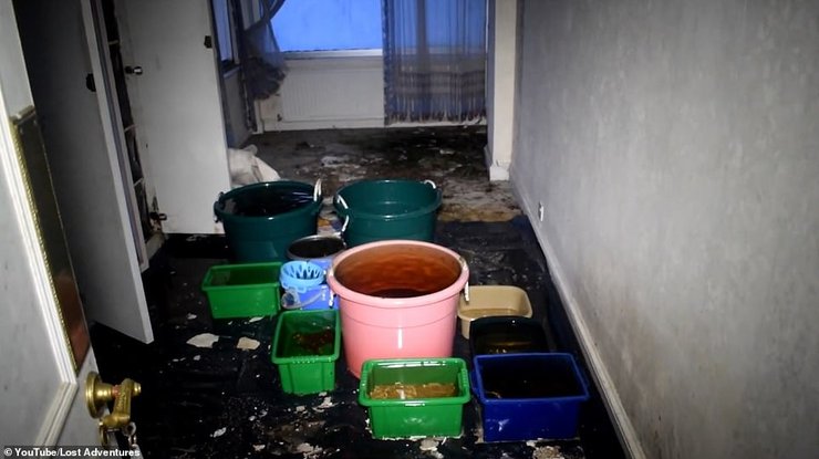 Более того, в доме нет мебели, обои ободраны, а крыша протекает, чтобы предотвратить дальнейшее разрушение, кто-то расставил пластмассовые тазики под протечками.