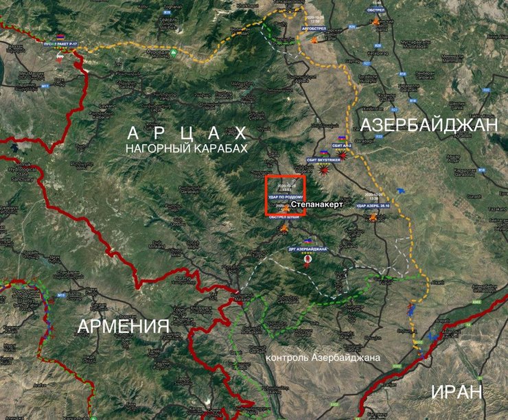 Одновременно проармянские СМИ сообщают о массированных обстрелах городов Нагорного Карабаха, публикуя кадры последствий этих обстрелов, и даже сами авианалеты с заснятым падением бомб. Как сообщил российский военный журналист Семен Пегов: "Источники в Стамбуле сообщают о том, что удары по городам Арцаха наносили турецкие ВВС, по личному приказу Эрдогана".