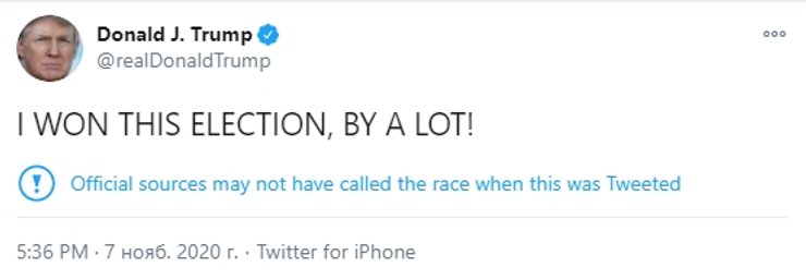 Примечательно, что за пару часов до этого Трамп написал в Twitter, что он "побеждает на этих выборах с большим отрывом". В соцсети под твитом республиканца оставили плашку "официальный подсчет голосов еще не завершен".
