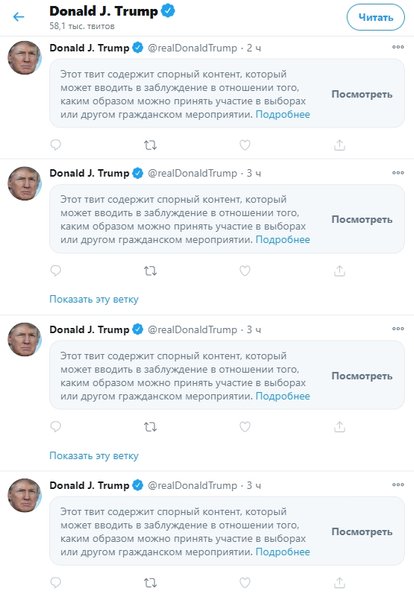 А до этого модераторы Twitter скрыли 4 подряд публикации Трампа как "спорный контент". В них он рассказывал о неких нарушениях при подсчете голосов.