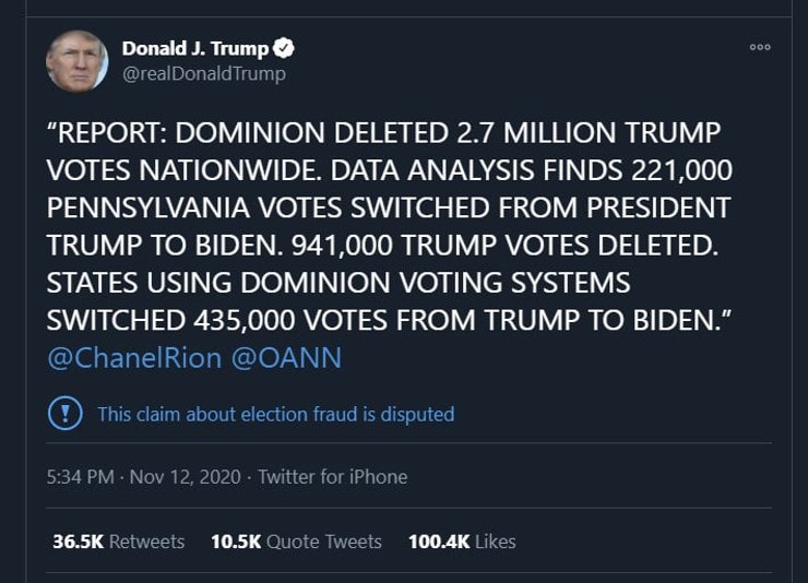 Накануне Дональд Трамп заявил, что у него путем различных махинаций украли голоса примерно 2,7 млн избирателей. Именно столько "аннулировала" система голосования Dominion, утверждает Трамп. Например, 221 тысяча голосов в штате Пенсильвания были поданы за Трампа, но неожиданно засчитаны в пользу Байдена. Еще 941 тысяча голосов за Трампа просто пропала, утверждает кандидат.
