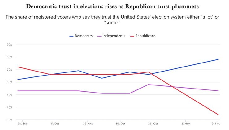 Пока что никем не доказано, что эти ошибки и "программные сбои" не случайные, а намеренные. Однако доверие к электронной избирательной системе Dominion серьезно подорвано, причем эта тенденция наблюдается как среди республиканцев, так и среди демократов.