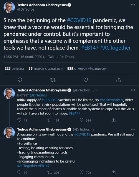"Вакцина сама по себе не покончит с пандемией COVID-19, – написал глава ВОЗ у себя в Twitter, в понедельник 16 ноября. – С момента возникновения пандемии мы знали, что вакцина сыграет решающую роль в том, чтобы взять ее под контроль. Но важно отметить, что вакцина дополнит другие рычаги, которые у нас имеются, а не заменит их".