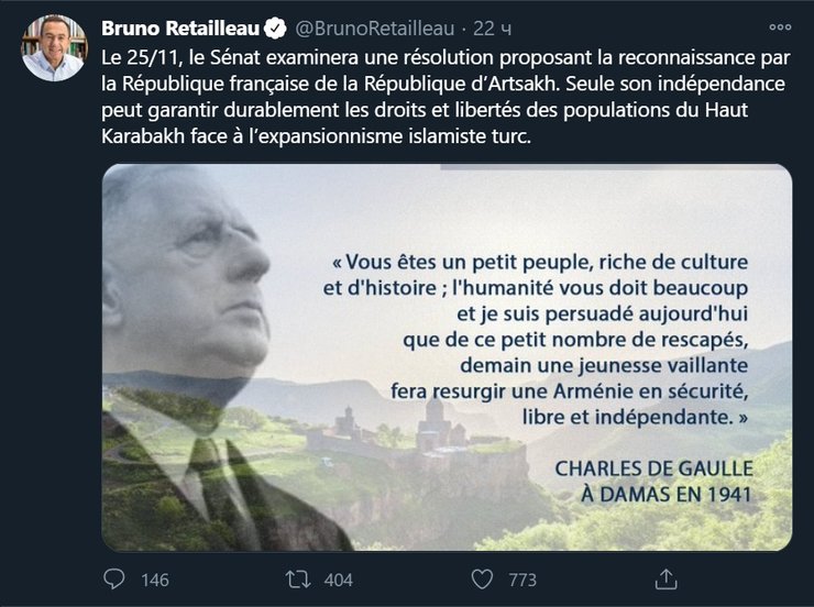"25 ноября Сенат рассмотрит постановление о признании Французской Республикой Республики Арцах. Только ее независимость может надежно гарантировать права и свободы населения Нагорного Карабаха перед лицом турецкого исламистского экспансионизма", – написал Ретайо.
