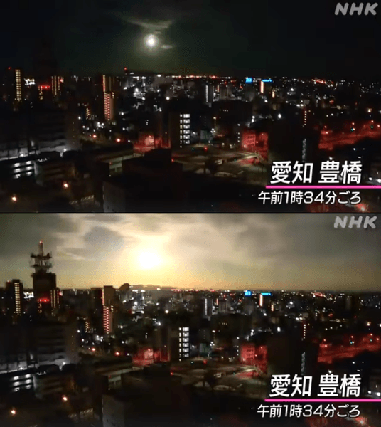 Кадры огромного светящегося шара, летящего сквозь ночное небо, были сняты японскими пользователями социальных сетей, а также зафиксированы камерами телеканала NHK.