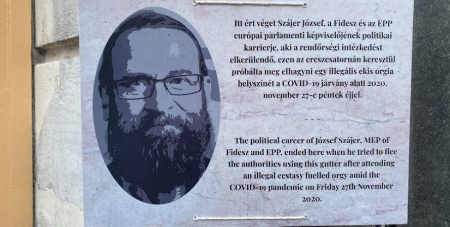 С табличкой тут же принялись фотографироваться проходящие мимо жители Брюсселя. Текст на ней гласит: "Политическая карьера Йожефа Саера, евродепутата от Фидес и ЕНП, закончилась здесь, когда он пытался скрыться от полиции с помощью этой трубы после того, как его поймали на незаконной оргии с использованием экстази во время пандемии COVID-19 27 ноября 2020". Авторы таблички — молодые оппозиционно настроенные венгры. Им захотелось непременно найти ту самую трубу и увековечить произошедшее на ней.