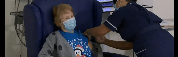 Первым пациентом, привитым вне рамки клинических испытаний, стала 90-летняя жительница города Ковентри Маргарет Кинан.