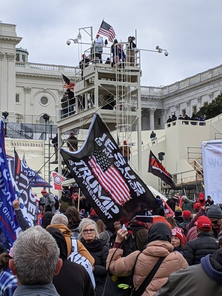 Полициейское оцепление было прорвано, не удержались и выставленные заграждения. Расчистив дорогу, сторонники Трампа двинулись внутрь, скандируя: "Нет фальсификациям!", "Еще четыре года!" и "США, США!".