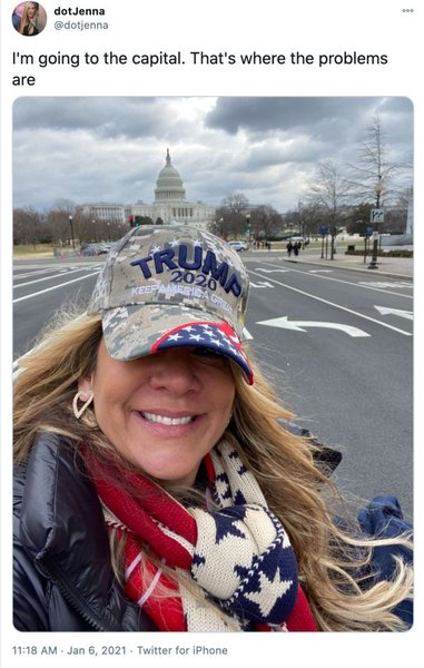 Жительница штата Техаса, риелтор и радиоведущая Джена Райан прилетела в Вашингтон на частном самолете и радостно позировала на фоне выбитых окон.