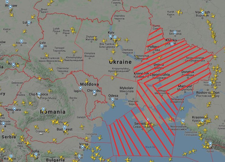 Таким образом, большая часть страны находится в зоне, где запрещены или не рекомендуются полеты для канадских самолетов. Дело в том, что украинское воздушное пространство делится на районы, которые управляются диспетчерскими центрами "Украэроруха". Днепровский район распространяется на Харьков, Днепр, Запорожье, Донецк, Луганск и часть Крыма.