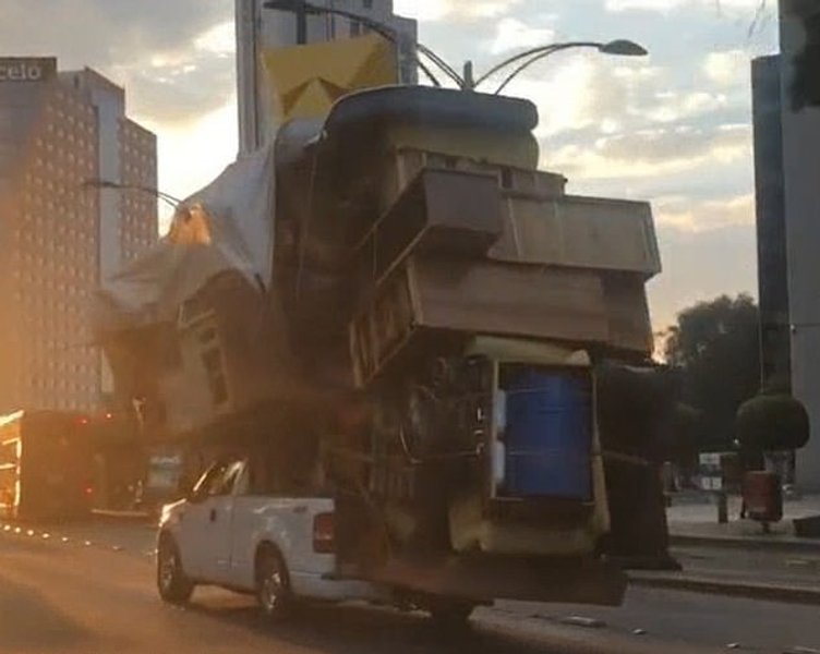 Все дело в том, что на багажник этого транспортного средства переезжающий хозяин умудрился погрузить все домашние пожитки, среди которых были шкафы, кровати, комоды, кушетки, столы и даже металлический предмет, напоминающий бензобак.