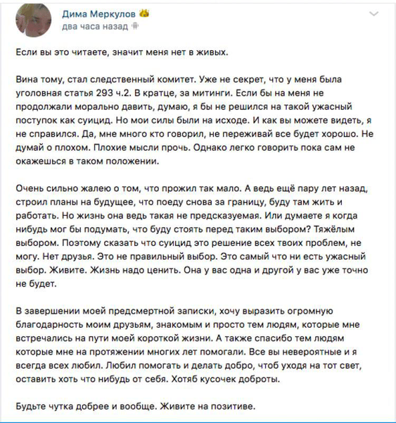 "Если вы это читаете, значит меня нет в живых. Вина тому, стал следственный комитет. Уже не секрет, что у меня была уголовная статья 293 ч. 2. В кратце, за митинги. Если бы на меня не продолжали морально давить, думаю, я бы не решился на такой ужасный поступок как суицид. Но мои силы были на исходе. И как вы можете видеть, я не справился", — написал Стаховский (орфография сохранена).