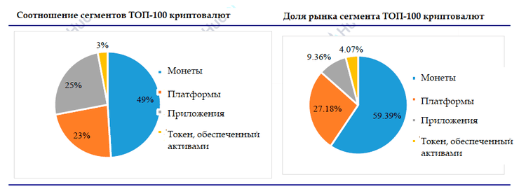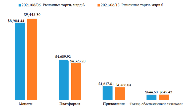 Распределение рыночных сегментов 100 лучших криптовалюта оставался стабильным. По состоянию на 13 июня 2021 среди 100 лучших проектов количество проектов класса монет, проектов класса приложений, проектов классов маркеров, обеспеченные активами и классов платформ остаются неизменными, что составляет 59,39% от общей рыночной капитализации ТОП-100 проектов.