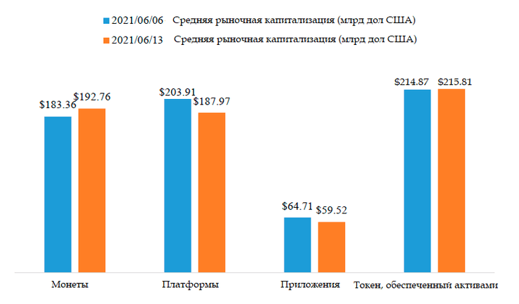 По состоянию на 13 июня 2021 общая рыночная капитализация монетных проектов достигла 944 500 000 000. Долларов США, увеличившись на 5,13%. Средняя рыночная капитализация монетных проектов достигла 19200000000. Долл. США, увеличившись на 5,13%. Общая рыночная капитализация проектов платформ достигла 432 300 000 000. Долл. США, уменьшившись на 7,82%. Средняя рыночная капитализация проектов платформ достигла 18700000000. Долл. США, уменьшившись на 7,82%. Общая рыночная капитализация проектов класса приложений достигла 148 800 000 000. Долл. США, уменьшившись на 8,02%. Средняя рыночная капитализация проектов класса приложений достигла 5950000000. Долл. США, уменьшившись на 8,02%. Общая рыночная капитализация проектов маркеров, обеспечиваются активами, достигла 64700000000. Долл. Средняя рыночная капитализация проектов маркеров, обеспечиваются активами, достигла 21500000000. Долл.