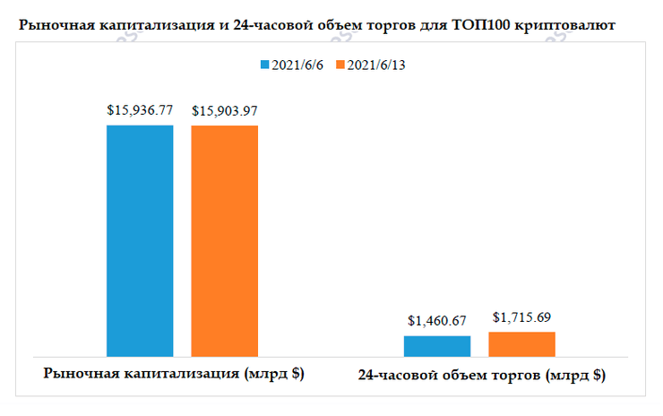 На этой неделе общая рыночная капитализация для 100 лучших криптовалюта уменьшилась на 1,98%, при этом 81 проект уменьшился в разной степени. По данным coinmarketcap , по состоянию на 13 июня 2021 общая рыночная капитализация криптовалюта составила 1629,1 млрд долл. неделю, среди которых XTZ имел наибольший рост на 37,13%, доведя свою рыночную капитализацию с № 49 по № 40, ICP больше снизился на 35,84%, доведя свою рыночную капитализацию с № 11 по № 18.