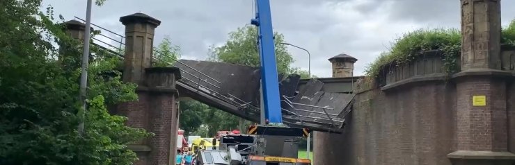 Утром автомобильный кран ехал по дороге и задел "стрелой" железнодорожный мост 19 века, который возвышался над проезжей частью. Как можно наблюдать на фото, конструкция получила значительные повреждения, одна боковая сторона оборвалась и провисла вниз под весом машины.