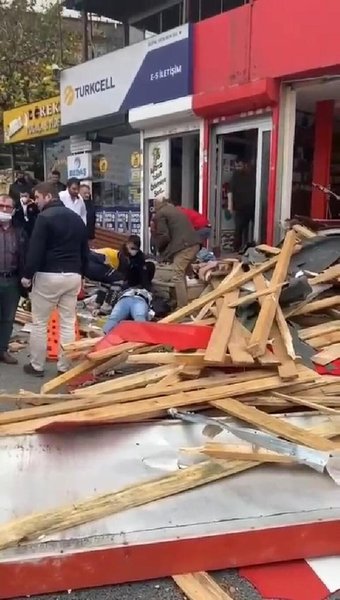 Ветер срывает крыши и части фасадов зданий по всему городу. Так, из-за падения крыши кафе в районе Багджилар пострадали двое прохожих и шесть автомобилей (фото справа).