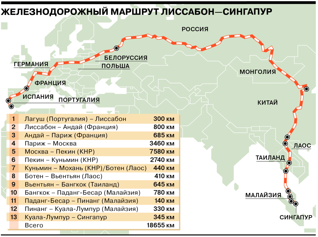 Теперь из столицы Португалии в Сингапур можно доехать поездом за три недели. За это время пассажиры проедут через 13 стран, в числе которых Испания, Франция, Германия, Россия, Монголия, Китай, Лаос, Таиланд и Малайзия.