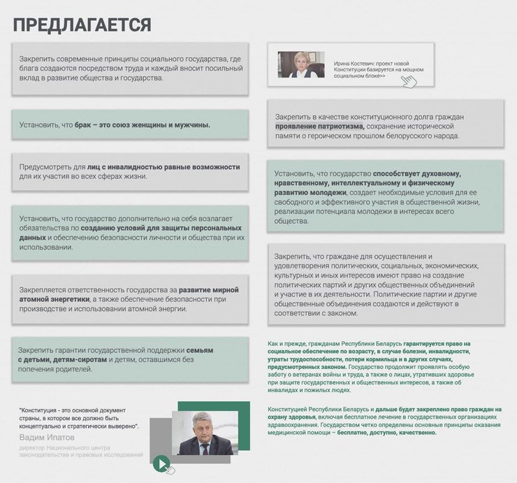 Кроме изменения структуры власти, беларусам предлагают одобрить конституционные изменения в части принципов социального государства. В обновленной конституции предлагается установить, что брак – это союз женщины и мужчины.