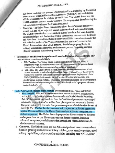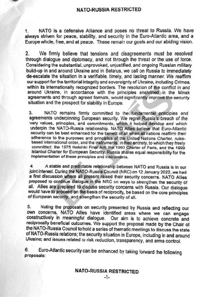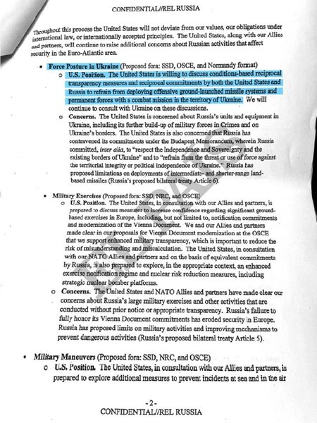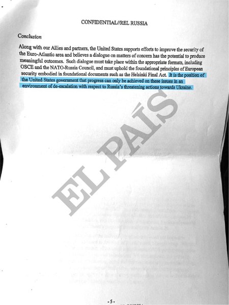 В распоряжении испанских журналистов оказался текст ответов США и НАТО по предложенным Россией в декабре гарантиям безопасности. Альянс изложил свое видение ситуации на на четырех страницах, а Вашингтон — на пяти. Они были опубликованы в итальянской газете El País.