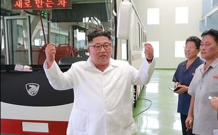 Рабочие североирландского завода по производству двухэтажных лондонских автобусов получают напутствия от Джонсона, в то время как Ким также дает напутствия на строительство северокорейских автобусов.