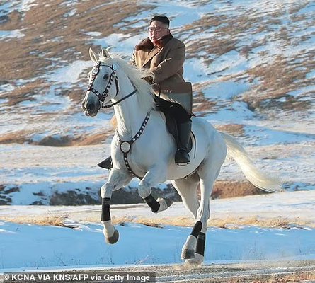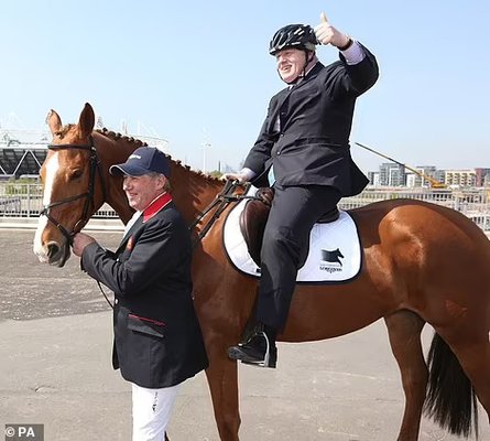 Бориса Джонсон катается на лошади по Олимпийскому парку Лондона с обладателем золотой медали Ником Скелтоном в 2013 году, а Ким Чен Ын скачет по склону горы.