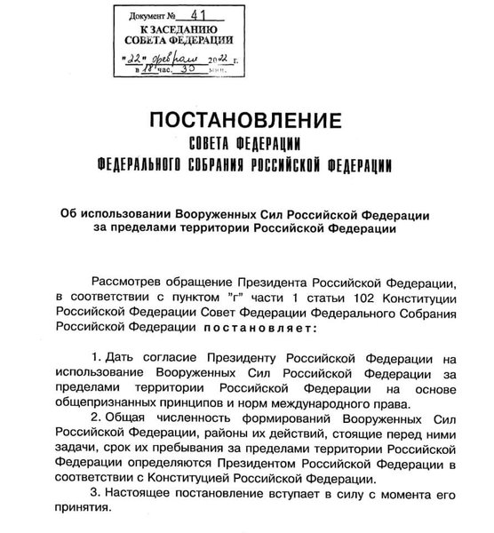 Профильные комитеты Совета федерации изначально рекомендовали разрешить Путину использовать российскую армию в "ДНР" и "ЛНР". Члены Совфеда предложили, чтобы постановление об использовании войск начало действовать с 22 февраля.