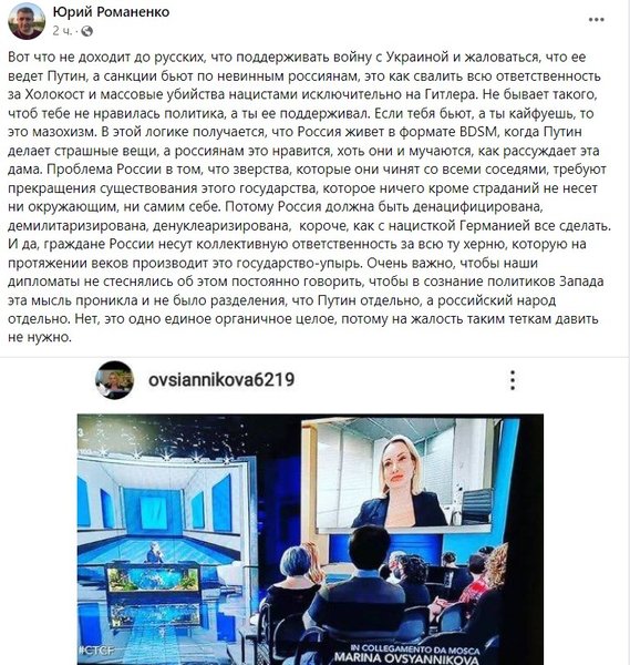 "Вот что не доходит до русских, что поддерживать войну с Украиной и жаловаться, что ее ведет Путин, а санкции бьют по невинным россиянам, это как свалить всю ответственность за Холокост и массовые убийства нацистами исключительно на Гитлера. Не бывает такого, чтоб тебе не нравилась политика, а ты ее поддерживал. Если тебя бьют, а ты кайфуешь, то это мазохизм. В этой логике получается, что Россия живет в формате BDSM, когда Путин делает страшные вещи, а россиянам это нравится, хоть они и мучаются, как рассуждает эта дама. Проблема России в том, что зверства, которые они чинят со всеми соседями, требуют прекращения существования этого государства, которое ничего кроме страданий не несет ни окружающим, ни самим себе. Потому Россия должна быть денацифицирована, демилитаризирована, денуклеаризирована, короче, как с нацисткой Германией все сделать. И да, граждане России несут коллективную ответственность за всю ту херню, которую на протяжении веков производит это государство-упырь…".