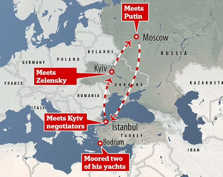В прошлую среду утром, 23 марта частный самолет Hawker 800XP с Романом Абрамовичем на борту вылетел из аэропорта Стамбула в Москву и передал Путину записку от Зеленского. В тот же вечер этот самолет вылетел из аэропорта российской столицы и вернулся в столицу Турции. После чего Абрамович связался с украинским политиком Рустемом Умеровым, который выступает в качестве переговорщика от Киева, а также с пресс-секретарем Реджепа Эрдогана Ибрагимом Калиным. По информации журналистов, им удалось добиться прогресса в будущих переговорах делегаций, которые должны пройти в Турции 29 марта. Также Абрамович и Умеров вылетели в Киев через Польшу, где встретились с Владимиром Зеленским.