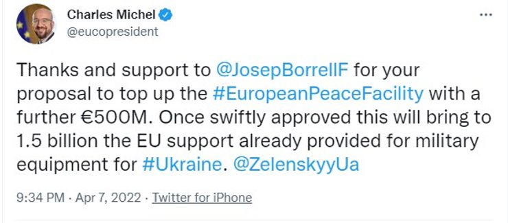 Европейский союз готовится предоставить Украине дополнительные 500 млн евро, которые пойдут на военную помощь. Об этом сообщил в Twitter глава Евросовета Шарль Мишель.