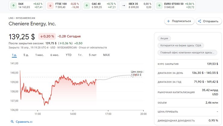После введения жестких экономических санкций против России экспортные терминалы СПГ в США работают на износ, пытаясь обеспечить мировой рынок, отчаянно нуждающийся в энергоресурсах. Инвесторы специализированных компаний по экспорту газа в Европу настроены оптимистично, поскольку на фоне глобальной экономической войны против РФ их, вероятно, ожидает успех. Об этом свидетельствуют исторический максимум цен на акции американской компании Cheniere Energy из Техаса, которая специализируется на производстве СПГ — за последний год акции Cheniere подорожали почти вдвое.