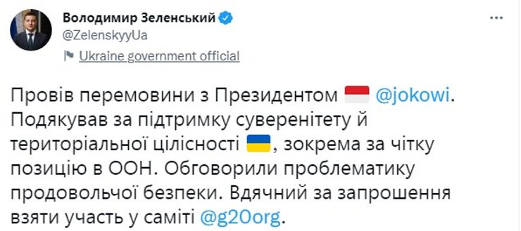 Президент Индонезии Джоко Видодо пригласил украинского коллегу Владимира Зеленского принять участие в саммите G20. Об этом глава государства написал в Twitter.