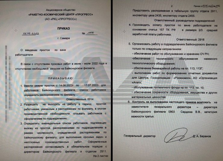 Канал опубликовал документ приказа АО "Ракетно-Космический Центр "Прогресс", датированного 2 июня 2022, в котором говорится об организации производственного процесса в июне-июле этого года. Во втором пункте приказа отмечается, что сотрудникам предприятия разрешается не выходить на работу в период простоя, но в случае необходимости они будут отозваны из отпусков "для выполнения срочных задач и неотложных производственных работ".
