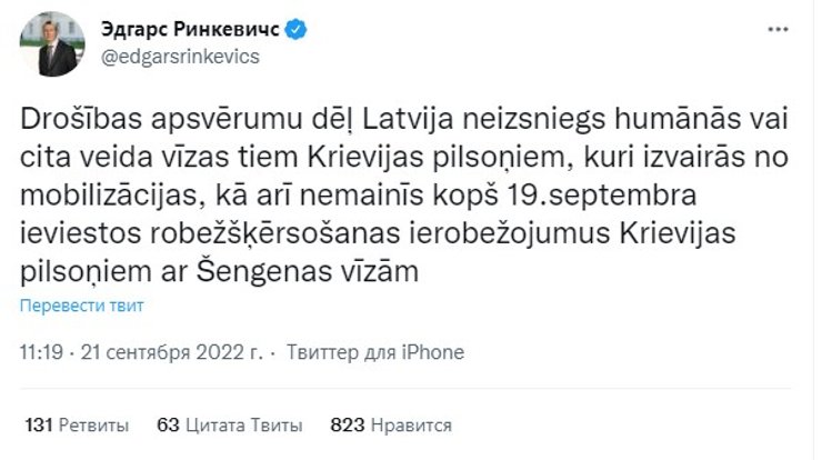 Министр иностранных дел Латвии Эдгарс Ринкевичс заявил, что страна не будет выдавать гуманитарные визы гражданам Российской Федерации, которые избегают мобилизации, по соображениям безопасности. Свое заявление глава МИД Латвии опубликовал в Twitter