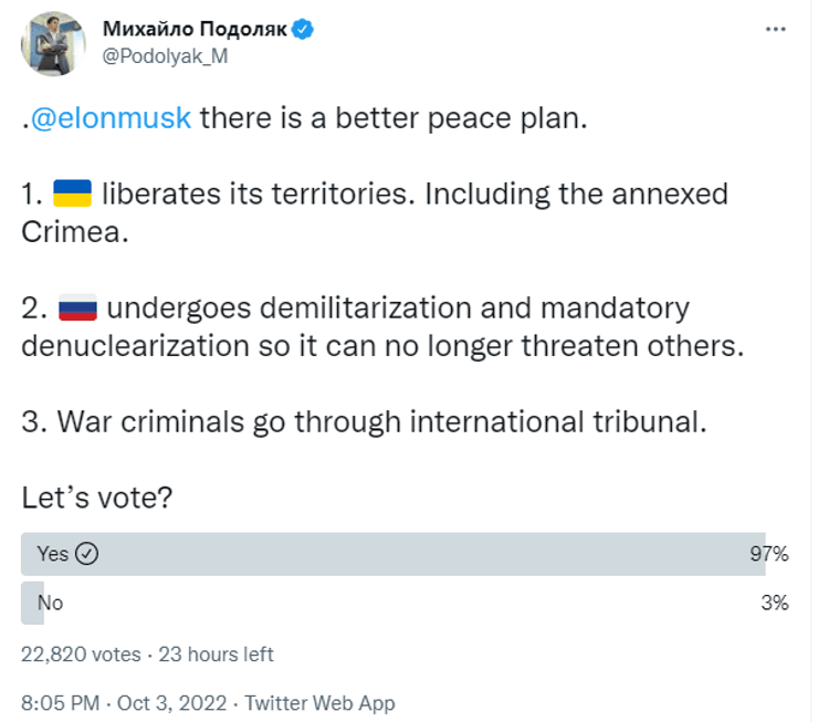 Советник главы Офиса президента Украины Михаил Подоляк выдвинул собственный мирный план с Россией: