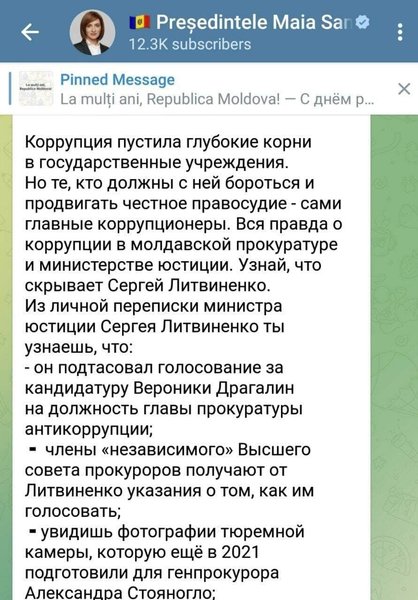 "Администрация главы государства сообщает, что официальный Telegram-канал президента Молдовы Майи Санду взломали. Также мы отрицаем правдивость последних сообщений", — заявили в ведомстве.